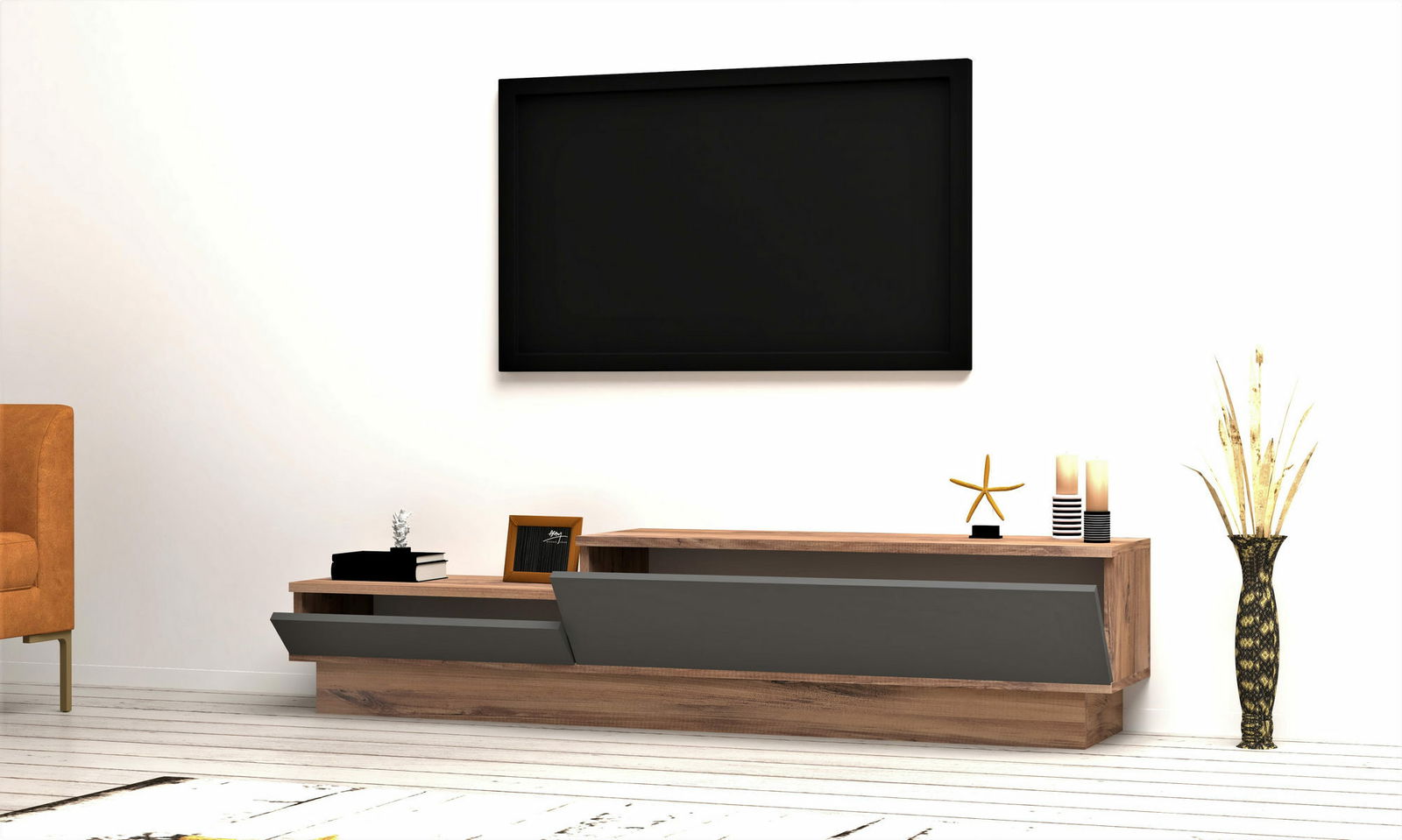 TV stolek/skříňka - Asi výška 35 cm, šířka 160 cm, hloubka 35 cm. Vyrobený z antlantického borového dřeva a antracitového povrchu. poskytuje dostatek prostoru pro uložení DVD, ovladačů a dalších věcí. kvalitní zpracování dělají z něj skvělý doplněk pro váš obývací prostor.