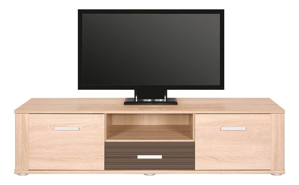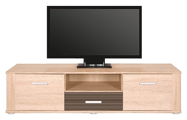 TV stolek/skříňka, který osloví svým stylem. Vybaven je dvěma rozměrnými prostory po stranách a jednou zásuvkou umístěnou uprostřed na spodku. Nad spodní zásuvkou je umístěn otevřený prostor (polička), určený pro Vaše audio/video zařízení. Tenké vodorovné šedé úchyty a ploché minimalistické tenké šedé nožičky dodávají styl. Tlumič dveří, který poskytuje jemné zavírání je v ceně produktu.