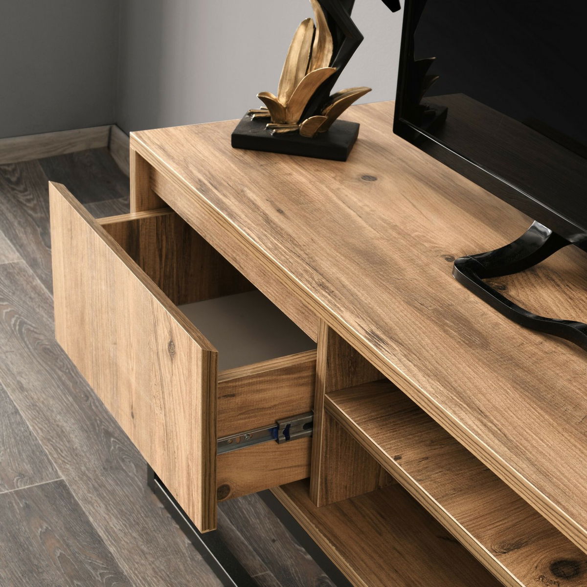 TV stolek/skříňka - Belli 140 je praktickým a stylovým doplňkem pro váš obývací prostor. S výškou 50 cm, šířkou 140 cm a hloubkou 40 cm poskytuje dostatek prostoru pro váš televizor, herní konzoli a další zařízení. Je vyroben z kvalitní 100% melaminové desky, což zaručuje jeho odolnost a dlouhou životnost. Jeho elegantní černý povrch a borové detaily dodávají tomuto stolku stylový vzhled, který se snadno hodí do různých interiérů. Současně poskytuje dostatek úložného prostoru pro vaše DVD, knihy a další věci. TV stolek/skříňka Belli 140 je ideálním řešením pro ty, kteří hledají spojení funkčnosti, kvality a elegantního designu ve svém domově.