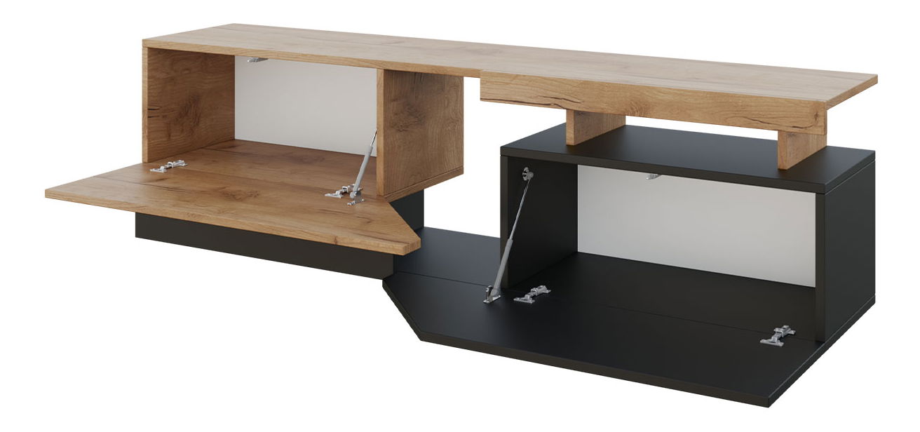Televizní skříňka se vyznačuje zajímavou geometrickou strukturou, která v kombinaci s použitými barvami dokonale zapadá do charakteru moderního i podkrovního interiéru. Model nabízí dvě skříňky, které můžete otevírat systémem otevírání PUSH TO OPEN. Další výhodou je otevřená police, kde můžete uložit digitální set-top box nebo televizní hru. Televizní skříňka Bekas je vyrobena z kvalitní laminované desky.