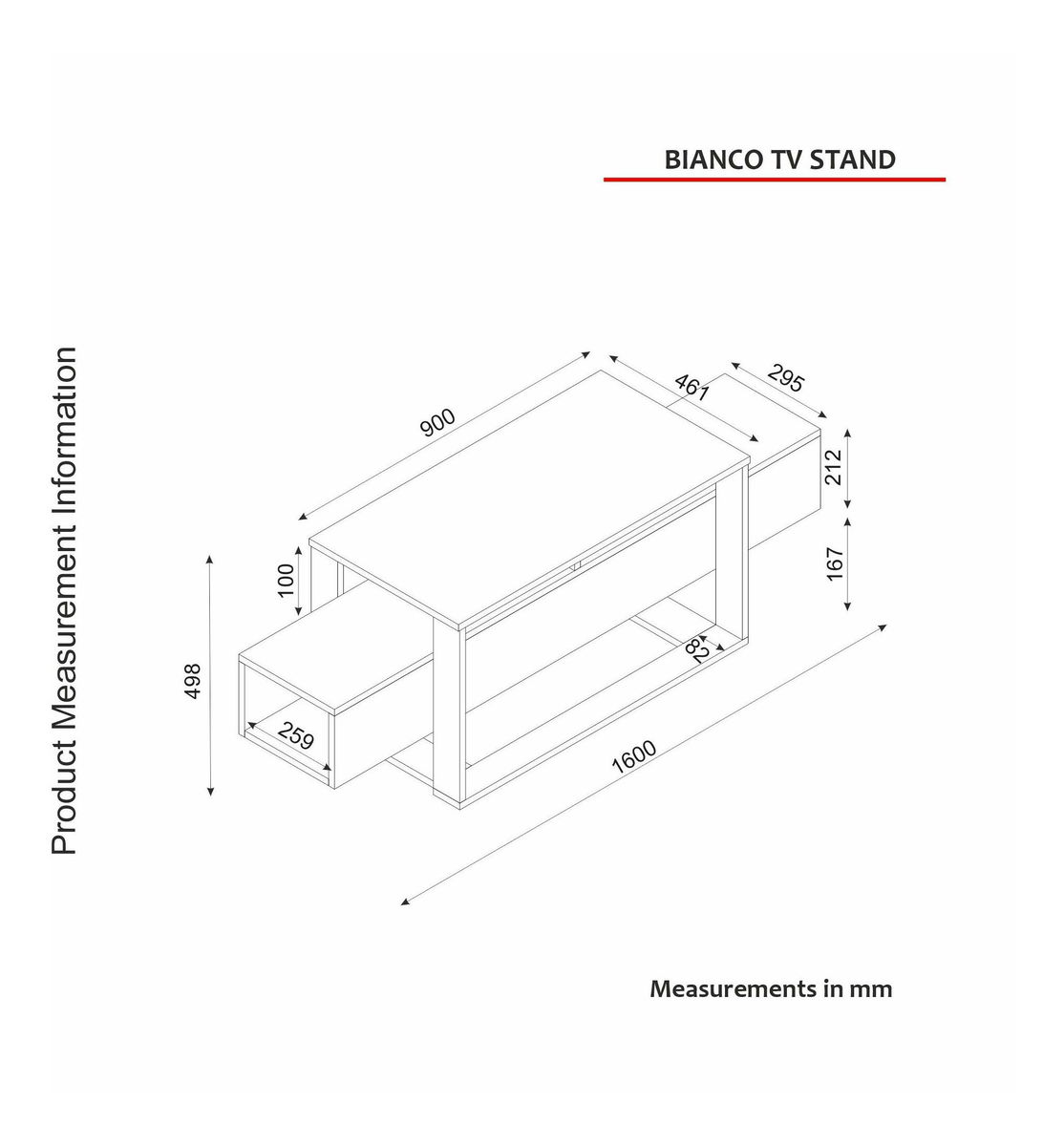 tloušťka: 18 mm, celková velikost: šířka: 160 cm, výška: 49,8 cm, hloubka: 46,1 cm, šířka horní police: 90 cm