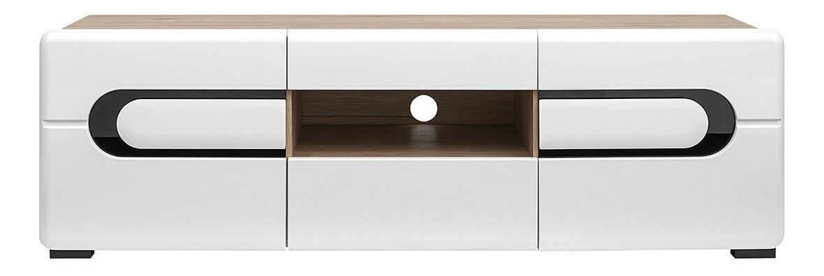 ZobrazitTV stolek je rozdělen na tři části dělícími stěnami. Krajní části jsou skříňky s jednou policí, střední část obsahuje dvě zásuvky a jeden otevřený prostor s otvorem pro kabely. Zajímavý design modelové řady Byron je doplněn o tvar rukojeti ve tvaru elipsy s prvky z černého tvrdého skla. Montáž je jednoduchá.