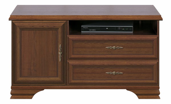TV stolek s luxusním designem Vás upoutá již na první pohled. Tvarované nožičky, ozdobně vyřezávané dvířka a zásuvky a vkusné kovové úchytky tvoří nadčasový design tohoto stolku. Má otevřenou poličku na AV zařízení. Uvnitř skříňky se nachází jedna police. Zásuvky jsou na válečkových kolejničkách.