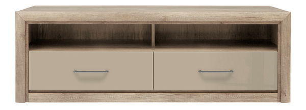 TV stolek obsahuje 2 otevřené police s praktickým otvorem pro kabely, na zadní stěně a 2 zásuvky na válečkových kolejničkách. Každá ze zásuvek mě bohatý úložný prostor.