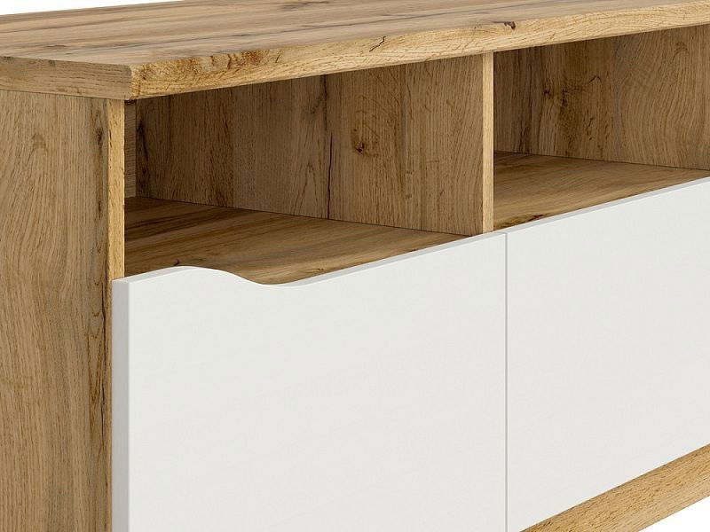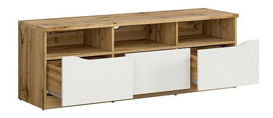 Praktická TV skříňka obsahuje úložný prostor v podobě 3 zásuvek. K dispozici jsou také 3 otevřené police. Na zadní stěně otevřených polic se nachází otvor na kabely. Originální upravená vrchní část čela nahrazuje rukojeti ke snadnému otevírání zásuvek.