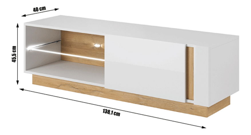 TV stolek/skříňka Cethos Typ 138 v bílém a dubovém odstínu s lesklým bílým povrchem je ideálním doplňkem pro váš obývací prostor. S výškou 45,5 cm a hloubkou 40 cm poskytuje dostatek místa pro televizi a další zařízení. Vyroben z DTD laminované desky s ABS hranami, stolek má maximální nosnost skleněné poličky až 3 kg. Tento model je vybaven push-up systémem a jedněmi dvířky, s policí pro další zařízení a bezúchytovým designem pro snadné používání. Skříňka je dodávána v demontu, o tloušťce materiálu 16 mm. Tento TV stolek/skříňka Cethos Typ 138 je dokonalou volbou pro moderní a praktický interiér.