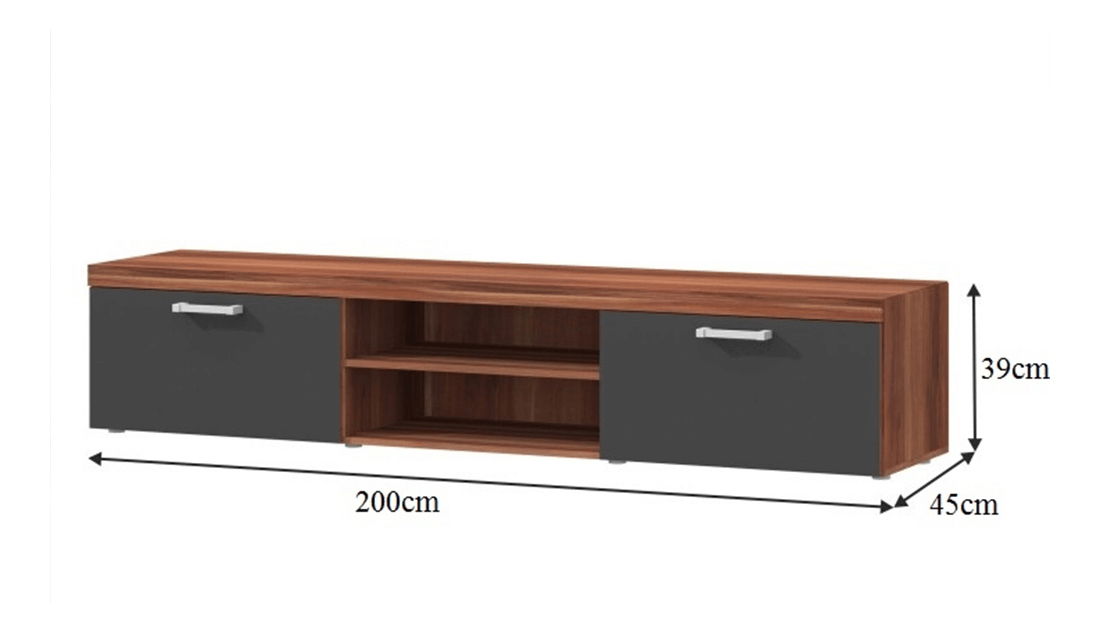 Tv stolek/skříňka Chamina 8 (švestka) o výšce 39 cm a hloubce 45 cm je ideálním způsobem, jak ušetřit místo a zároveň si vychutnat vaše oblíbené filmy a seriály na vašem televizoru. Nekupujte zbytečně drahé RTV stolky, raději investujte do kvality a novinek ve světě technologií. Chamina 8 nabízí dvě skříňky a otevřený úložný prostor pro vaše zařízení a jiné předměty. Vyroben z DTD laminované desky, tento stolek je odolný a stabilní. S barvou švestka / šedý grafit se dokonale hodí do moderně zařízeného obývacího pokoje. S rozměry 200x45x39 cm a tloušťkou materiálu 16 mm, tento stolek se snadno vejde do jakéhokoli prostoru. Chamina 8 se dodává v demontu, aby se minimalizovaly přepravní náklady a zjednodušila se montáž. Investujte do kvalitního TV stolku a užijte si vaše oblíbené filmy a seriály ve stylu.