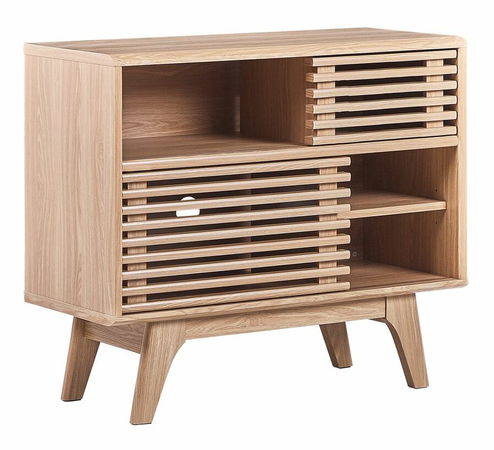 Jako TV stolek, knihovna, konferenční stolek nebo malá komoda – skříňka v módním retro stylu doplní design každého interiéru. Posuvné dveře ve dvou různých velikostech dodávají skříňce v barvě světlého dřeva hravý vzhled. Prostorné police poskytují dostatek úložného prostoru pro všechny potřebné věci či dekorace. Nohy, které jsou mírně nakloněné, dodávají skříňce moderní vzhled. Skříňka je pevná, snadno se udržuje a je odolná vůči vlhkosti.