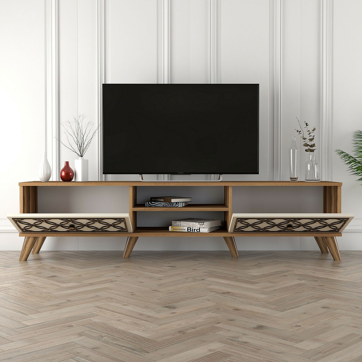 ZobrazitTV stolek/skříňka Clara (Ořech + Krémová) je elegantní a funkční kus nábytku, ideální pro váš obývací prostor. kombinaci ořehového a krémového odstínu dodává vašemu interiéru stylový a moderní vzhled. praktickými úložnými prostory, díky kterým můžete uspořádat kabely, dálkové ovladače a další drobnosti. Clara je vyrobena z kvalitních materiálů, což zaručuje její odolnost a dlouhou životnost.