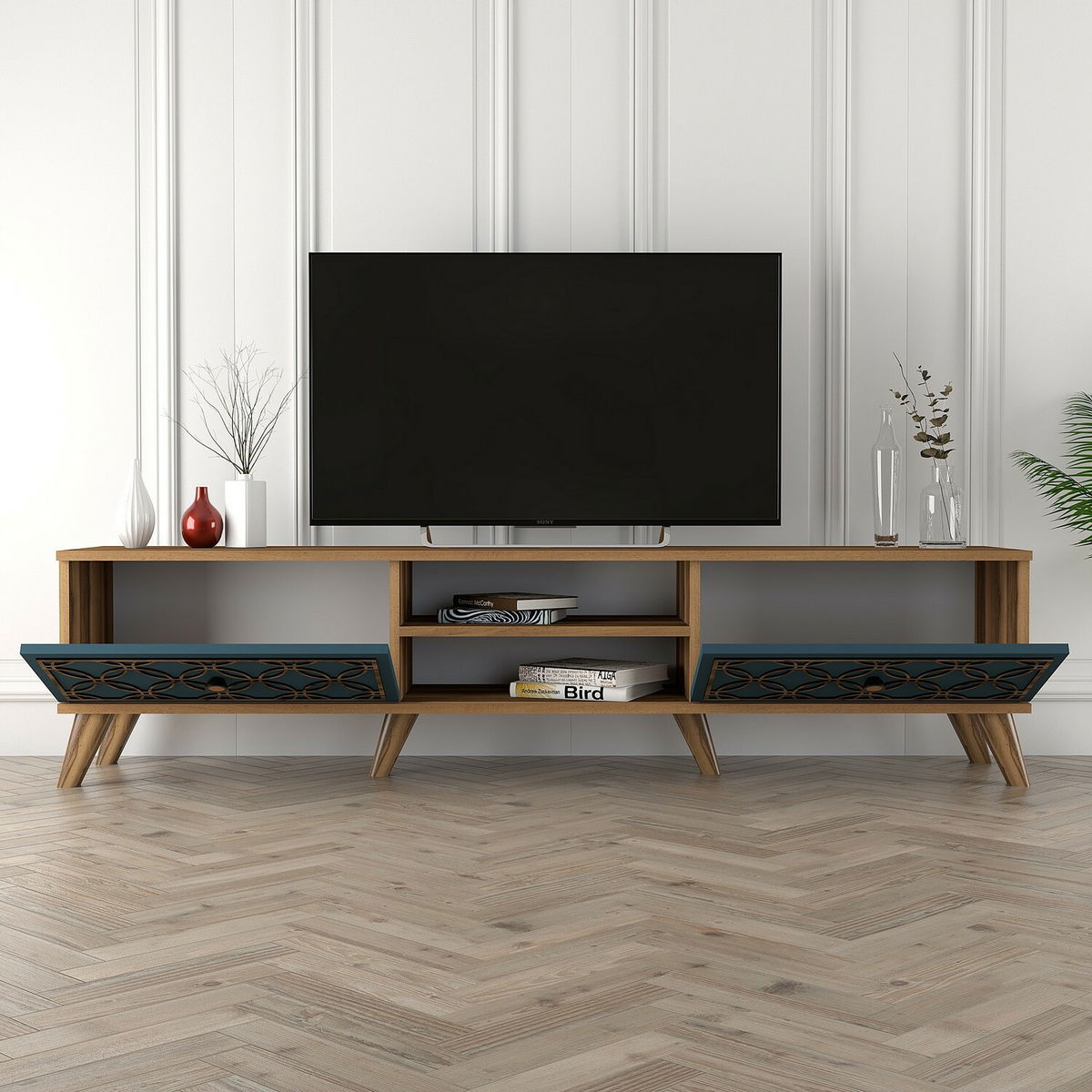 ZobrazitTV stolek/skříňka - Clara (Ořech + Modrá) je moderní a funkční nábytek, ideální pro uspořádání a uložení vaší televize a dalších elektronických zařízení. S výškou 44 cm, šířkou 180 cm a hloubkou 35 cm poskytuje dostatek místa pro vaši televizi, herní konzoli, DVD přehrávač a další příslušenství. Vyrobený z kvalitního ořechového dřeva a modrého odstínu, tento TV stolek/skříňka přinese do vašeho interiéru elegantní a stylový vzhled. Současně nabízí praktickou skříňku s policemi, kde můžete uschovat svá DVD, ovladače a jiné drobnosti. Clara je skvělou volbou pro ty, kteří hledají spojení funkčnosti a estetiky pro svůj televizní pokoj.