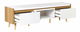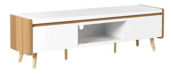 Díky tomuto TV stolku s dostatečným úložným prostorem bude váš obývací pokoj stále uklizený. Dvě prostorné zásuvky pojmou všechny náhradní kabely, dokumenty a jiné důležité věci, které potřebujete mít vždy po ruce. Police, s otvorem v zadní části pro zavedení kabelů, je ideálním místem pro umístění elektronického zařízení. Tento kousek se díky svému klasickému designu a neutrálním barvám hodí zejména do tradičních nebo skandinávsky laděných interiérů. Elegantní vzhled je zvýrazněn nohama z masivního dřeva, které zaručují extra stabilitu.