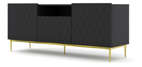 ZobrazitZařiďte si obývací pokoj v luxusním stylu s tímto elegantním TV stolkem/skříňkou Dintanna 145. Vysoký 62 cm, široký 145 cm a hluboký 42 cm, tento černý stolek s lesklým černým povrchem je ideální pro vaši televizi. Okouzlí vás jeho ozdobné frézování na dvířkách a robustní nožičky. Se třemi dvířky a menší otevřenou poličkou vám poskytuje dostatek úložného prostoru pro vaše mediální zařízení a další věci.