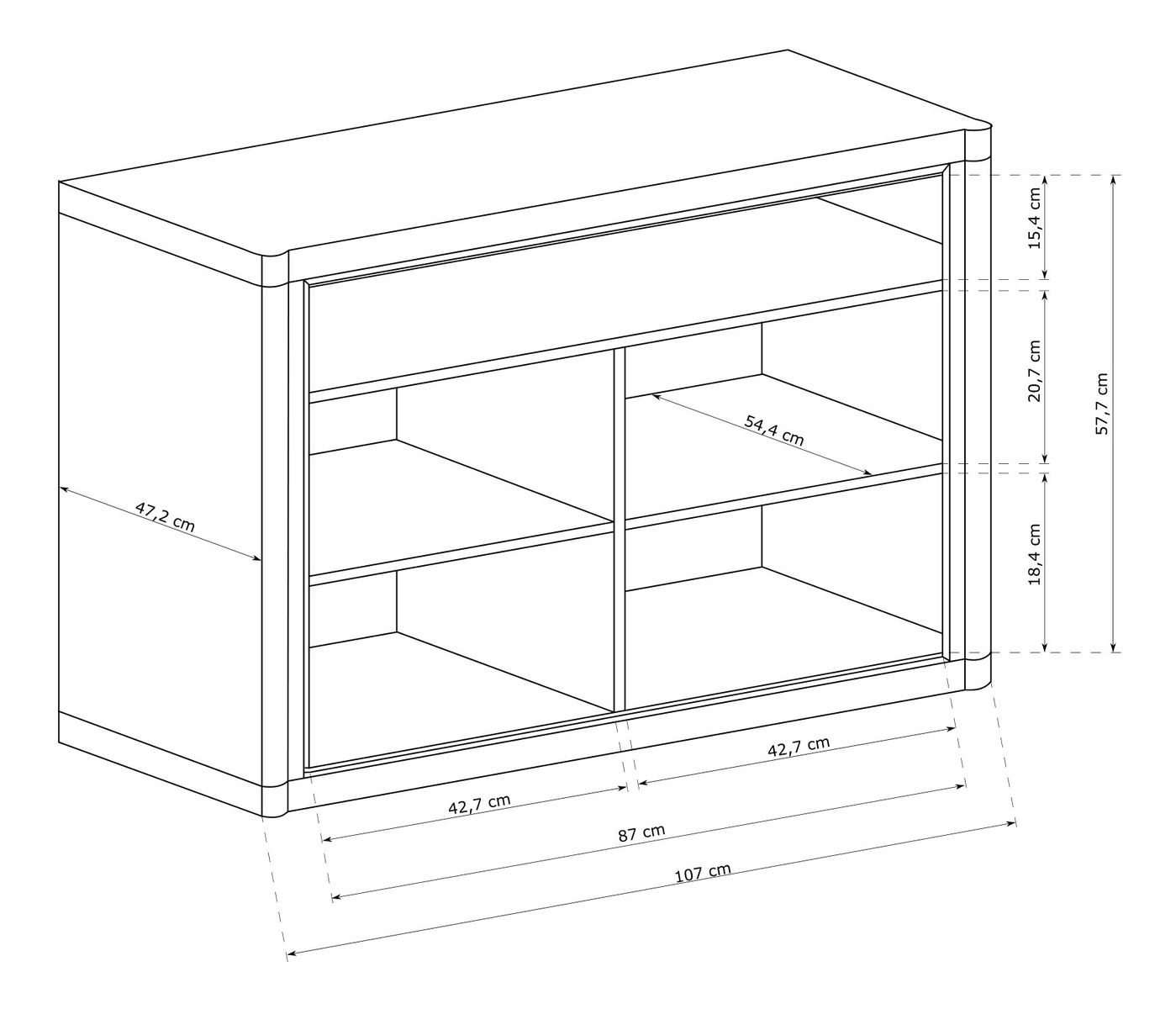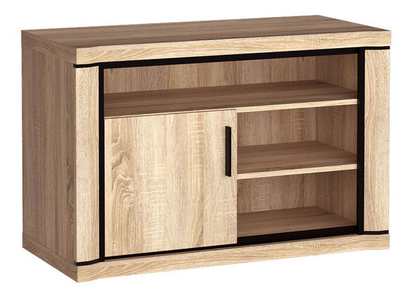 ZobrazitKrásná TV skříňka ve tvaru kvádru dokonale zapadá do trendů. Svým mimořádným vzhledem a vysokou funkčností bude skvěle vypadat mezi blízkými a vytvoří příjemnou atmosféru. Nábytek je vybaven třemi policemi, dvěma menšími a jednou větší, z nichž jedna je přikryta skříní. Ideální místo pro jakékoli drobnosti, doplňky nebo užitečné předměty. Nezapomeňme ani na desku, na které se budou skvěle vyjímat ozdoby a suvenýry. Černé rukojeti a lemy na přední straně z něj dělají úchvatné uspořádání.