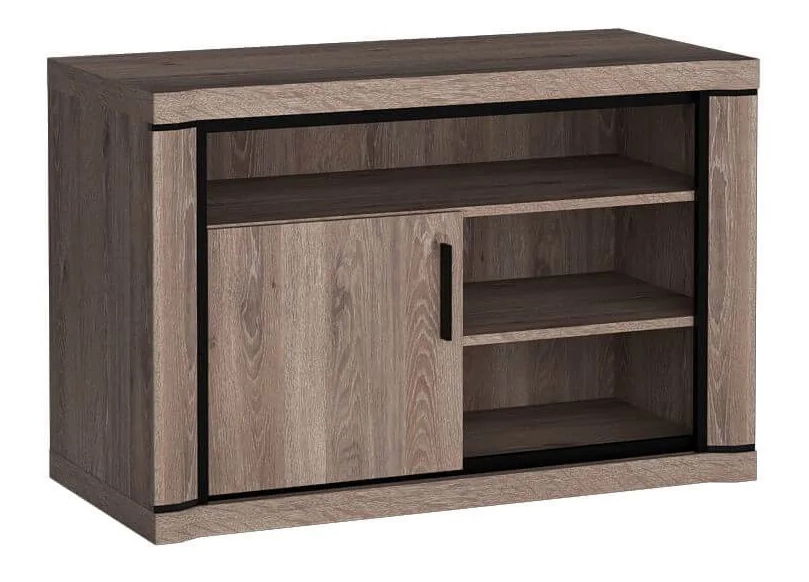 ZobrazitKrásná TV skříňka ve tvaru kvádru dokonale zapadá do trendů. Svým mimořádným vzhledem a vysokou funkčností bude skvěle vypadat mezi blízkými a vytvoří příjemnou atmosféru. Nábytek je vybaven třemi policemi, dvěma menšími a jednou větší, z nichž jedna je přikryta skříní. Ideální místo pro jakékoli drobnosti, doplňky nebo užitečné předměty. Nezapomeňme ani na desku, na které se budou skvěle vyjímat ozdoby a suvenýry. Černé rukojeti a lemy na přední straně z něj dělají úchvatné uspořádání.