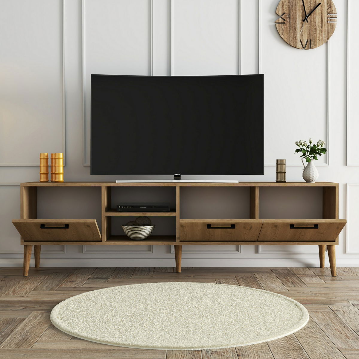 Velmi hezká TV skříňka v retro stylu. Vše přišlo pečlivě zabalené, nepoškozené, skříňka se velmi jednoduše složila podle přehledného návodu.