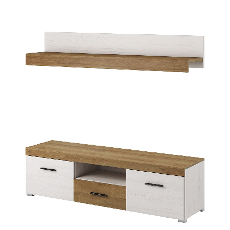 Tv stolek / skříňka, kterou doplňuje jednoduchá police a tak vytvářejí jednoduchý set, který Vám zpříjemní Vaši obývací místnost.