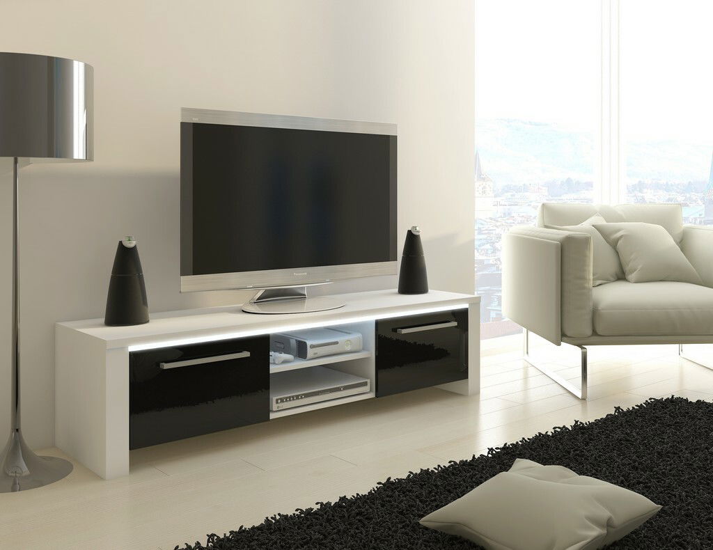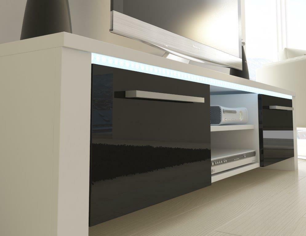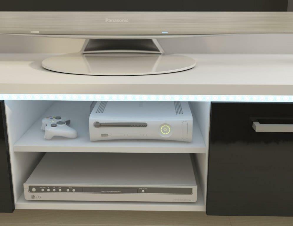 ZobrazitKlasický TV stolek s klasickým designem. No opak je pravdou. Svou jedinečnost ukáže až po setmění. Po celé délce horní desky se nachází volitelné LED osvětlení, které vypadá super a dodá nábytku a místnosti úžasný efekt. Ve střední části se nachází praktický prostor pro umístění audio/video techniky. Dvířka TV stolku jsou výklopné a jsou ve vysokém lesku. Podlouhlé úchyty působí elegantně. Barevné provedení je bílá matná v kombinaci s černou ve vysokém lesku.