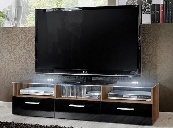 TV stolek/skříňka Fresh působí díky podsvícené horní desce velmi moderně. Deska je vyrobena z 8 mm silného tvrzeného skla. V dolní části se nacházejí tři zásuvky, nad kterými je otevřený úložný prostor pro uložení audio/video příslušenství. Fronty jsou vyrobeny ve vysokém lesku.