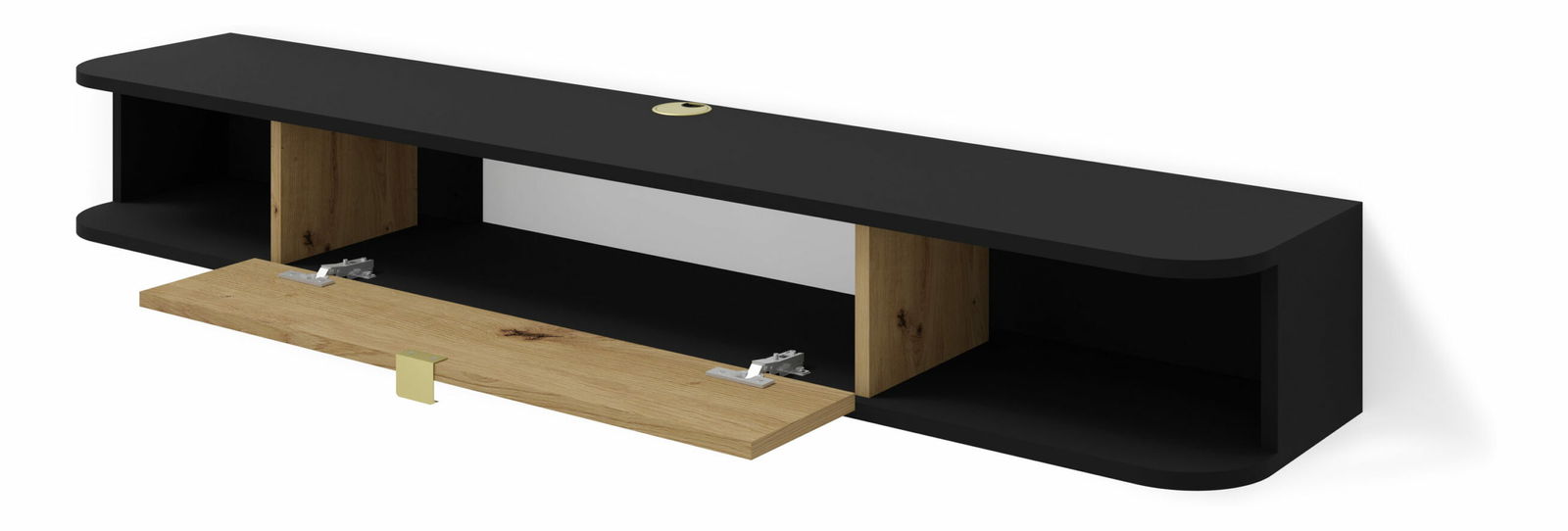 ZobrazitIkaro je moderní a praktická nástěnná TV skříňka. Ostré hrany se pomalu stávají minulostí a interiéry přijímají trend příjemných, zaoblených povrchových úprav nábytku, což odlišuje náš návrh. Tvary s jemnými liniemi podporují relaxaci, přinášejí do interiéru harmonii a klid. Ikaro se vyznačuje i kompaktními rozměry – není to těžkopádný, těžký kus nábytku. Získáme tak na funkčnosti skříňky a ergonomii prostoru v místnosti. V horní desce pracovní desky je otvor pro kabel s ozdobným zlatým krytem, který ladí s kovovou úchytkou stejné barvy. Skříňka je dvouúrovňová a sestává z jedné přihrádky otevírající se směrem dolů a dvou polic po stranách.
