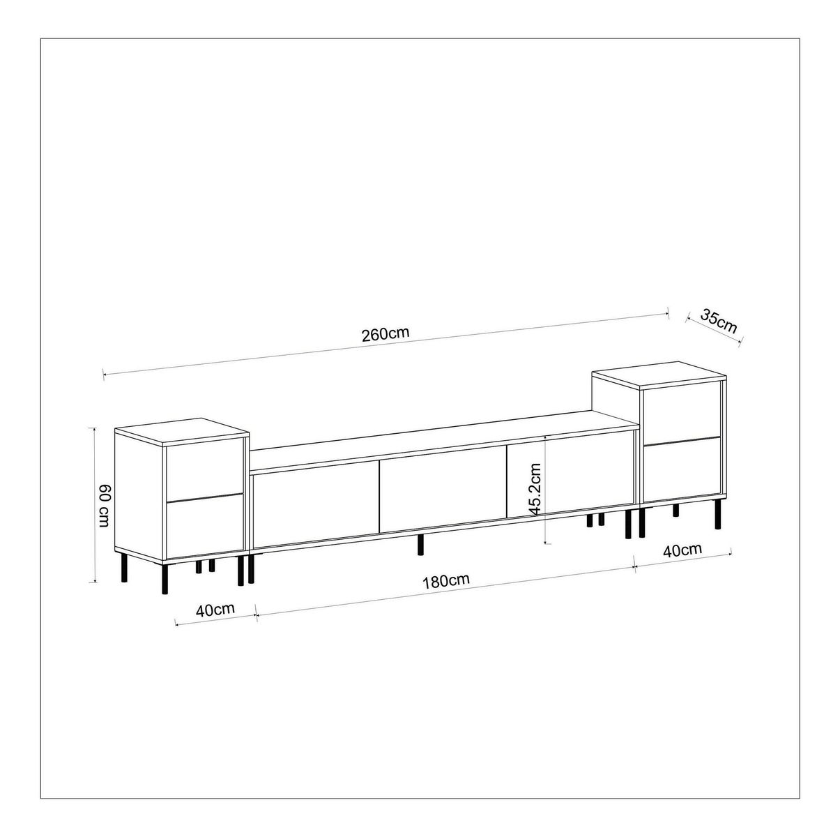 tloušťka: 18 mm, stojan na TV: šířka: 180 cm, výška: 45,2 cm, hloubka: 35 cm, noční stolek: šířka: 40 cm, výška: 60 cm, hloubka: 35 cm, (2 kusy) celkem: šířka: 260 cm, výška: 60 cm, hloubka: 35 cm