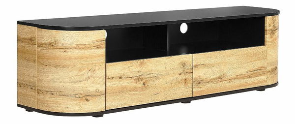 tomu, aby byl váš obývací pokoj kompletní, potřebujete vhodný nábytek s úložným prostorem, který bude praktický a zároveň dekorativní. Tento TV stolek v trendovém rustikálním designu má dostatek úložného prostoru díky dvěma otevřeným policím a dvěma prostorným zásuvkám. Zaoblené boční strany s dvířky ukrývají další praktické police. Pokud se na něj rozhodnete položit televizor nebo jiné zařízení, jistě oceníte otvory pro kabely na zadní straně nábytku. Stolek nevyžaduje každodenní údržbu, protože je vyroben z kvalitního MDF materiálu.