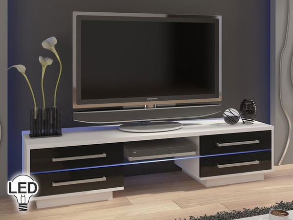 Běžný TV stolek, ale s jedinečnou novinkou. Mezi zásuvky je umístěna skleněná polička, kterou si můžete efektně podsvítí volitelným LED osvětlením. To vypadá super a dodá nábytku a místnosti úžasný efekt. TV stolek nabízí úložný prostor v podobě čtyř zásuvek a otevřené místo pro uložení Vaší audio/video techniky. Barevné provedení je bílá matná v kombinaci s černou ve vysokém lesku.
