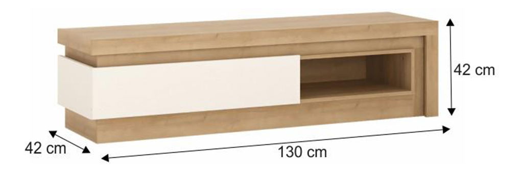 Luxusní TV stolek, který bude nádherným doplňkem Vaší obývacího pokoje. TV stolek má efektní LED osvětlení po obvodu. Má i praktickou poličku pro Vaše audio/video zařízení. Použité materiály jsou odolné vůči poškrábání a vlhkosti. Barevné provedení TV stolku je dub riviera a extra vysoký lesk bílý.