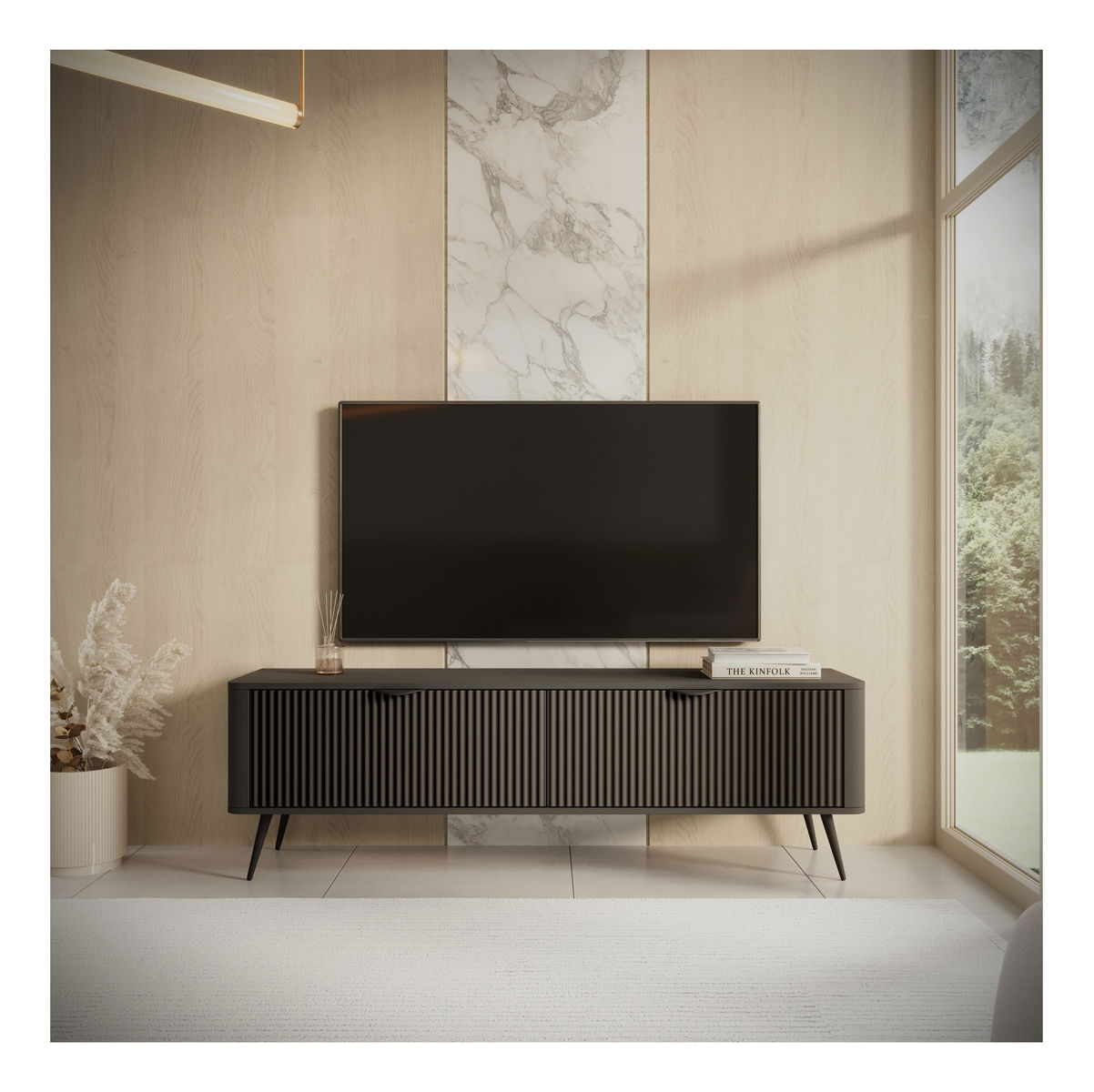 TV Stolík/Skrinka Lethe I (čierna) je štýlovým a funkčným doplnkom vášho obývacieho priestoru. Je vyrobený z laminovanej drevotriesky, s MDF hrúbkou 16 mm po stranách a 18 mm na prednej časti, čo zaručuje odolnosť a pevnosť. Stolík disponuje 2 dvierkami, ktoré poskytujú dostatok úložného priestoru. Zlaté kovové úchytky a nožičky pridávajú luxusný nádych a stabilitu. Tento TV stolík/skriňka kombinuje moderný dizajn a praktickosť, ideálny pre vašu domácnosť.