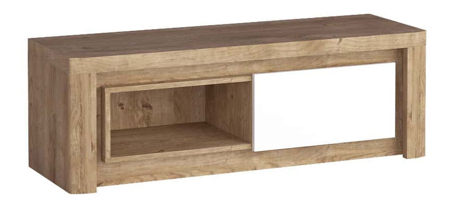 Malá RTV skříňka pod TV, do bytu, kde nemáme moc místa. Moderní, v krásné přírodní barvě. Kombinace barvy dřeva ribbeck a bílé v podobě lesklých front. Spolu vytvářejí úžasný efekt. Je to perfektní kus nábytku jako stvořený do obývacího pokoje. Za bílými dvířky vpravo bude místo k zavření některých věcí a také polička, na kterou můžeme umístit satelitní TV set-top box. V nabídce je také osvětlení, které je součástí setu. Může být namontováno tak, že horní část skříňky a boky budou osvětleny.