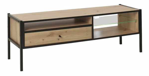 Velmi pěkný a jednoduchý stolek pod TV z řady Luigi se stane příjemným doplňkem vašeho obývacího pokoje. Stolek disponuje širším šuplíkem, do kterého můžete ukrýt stolní hry či dokumenty. Pravá část stolku je určena pro vaše audio nebo video zařízení. V této části je jedna skleněná polička, ke které si můžete přikoupit i osvětlení. Stolek stojí na kovových vyšších nožičkách, takže můžete tento prostor využít pro dekorace či knihy. Šmrnc tomuto stolku dodává černá barva, která se nachází na obrubě celého nábytkového systému Luigi a na kovových nožičkách. TV skříňka je vyrobena z laminované dřevotřísky.