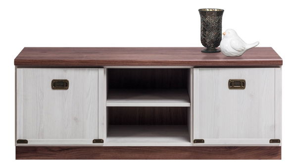 TV stolek/skříňka, který dodá Vašemu obývacímu pokoji žádaný styl. Vybaven je dvěma skříňkami s dvířky po obou stranách a dvěma otevřenými poličkami uprostřed určenými pro Vaše audio/video zařízení. Zajímavé úchyty na dvířkách a spodní části v provedení mosaz.