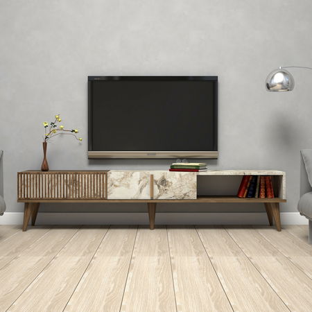 ZobrazitTV stolek/skříňka model Michelle (Ořech + Bílá) je praktickým a stylovým doplňkem pro váš obývací prostor. S výškou 40 cm, šířkou 180 cm a hloubkou 35 cm, tento nábytek poskytuje dostatek prostoru pro vaši televizi, média a další elektronická zařízení. Jeho barevná kombinace ořechového a bílého odstínu přináší do vašeho interiéru moderní a elegantní vzhled. Tvrdý dřevěný materiál zajišťuje trvanlivost a odolnost stolku/skříňky. S tímto produktem získáte praktické řešení pro uspořádání a organizaci vašeho televizního vybavení. Dobře se hodí do každé moderní domácnosti a doplní váš interiér stylovou a funkční formou.