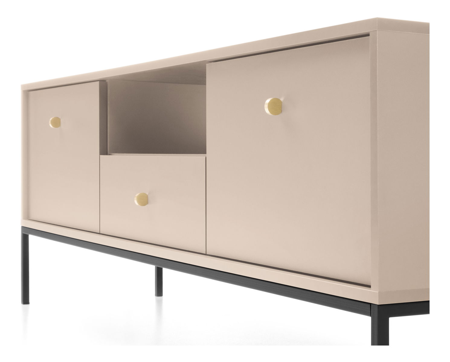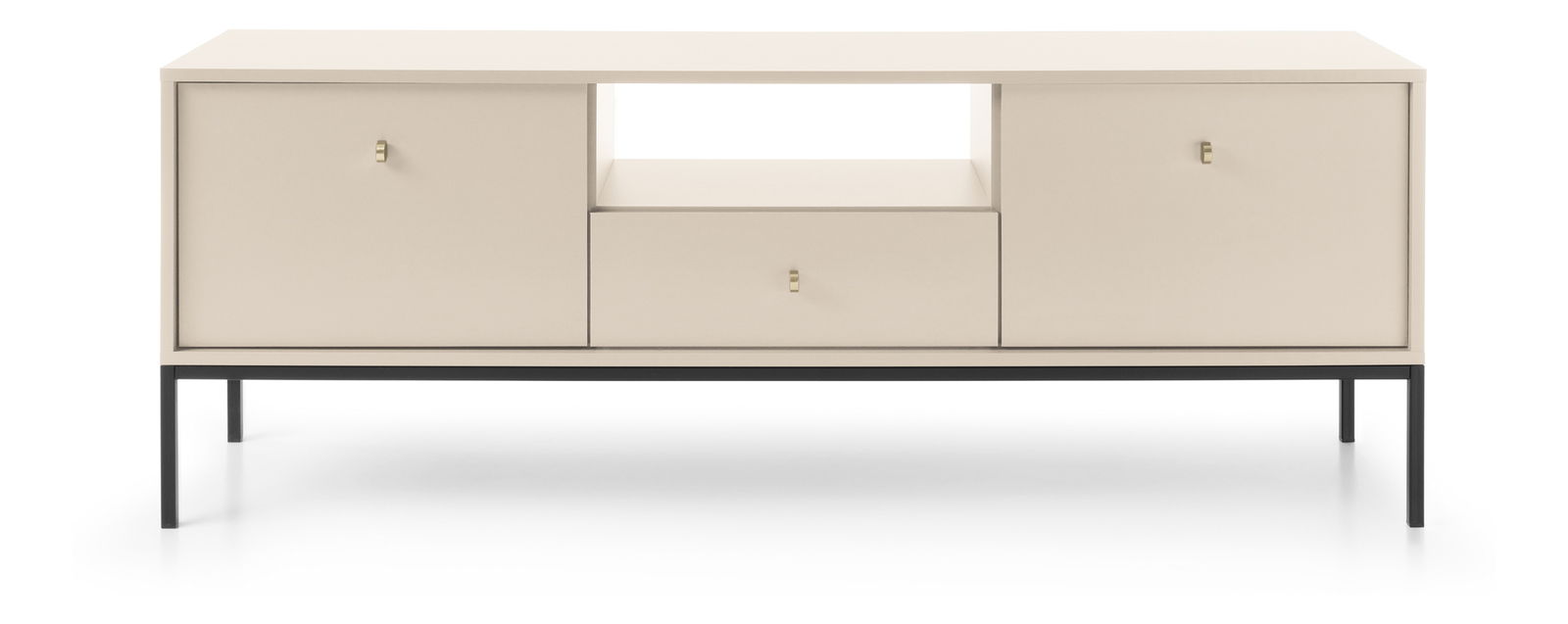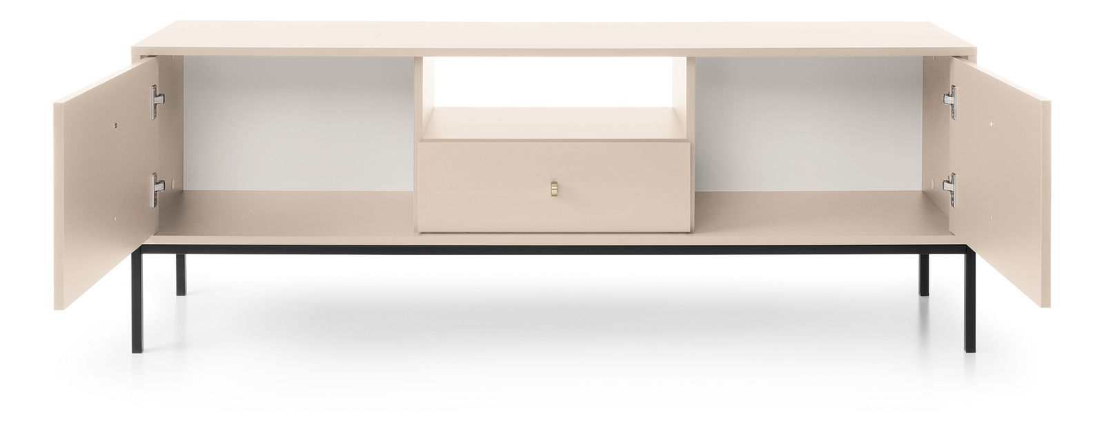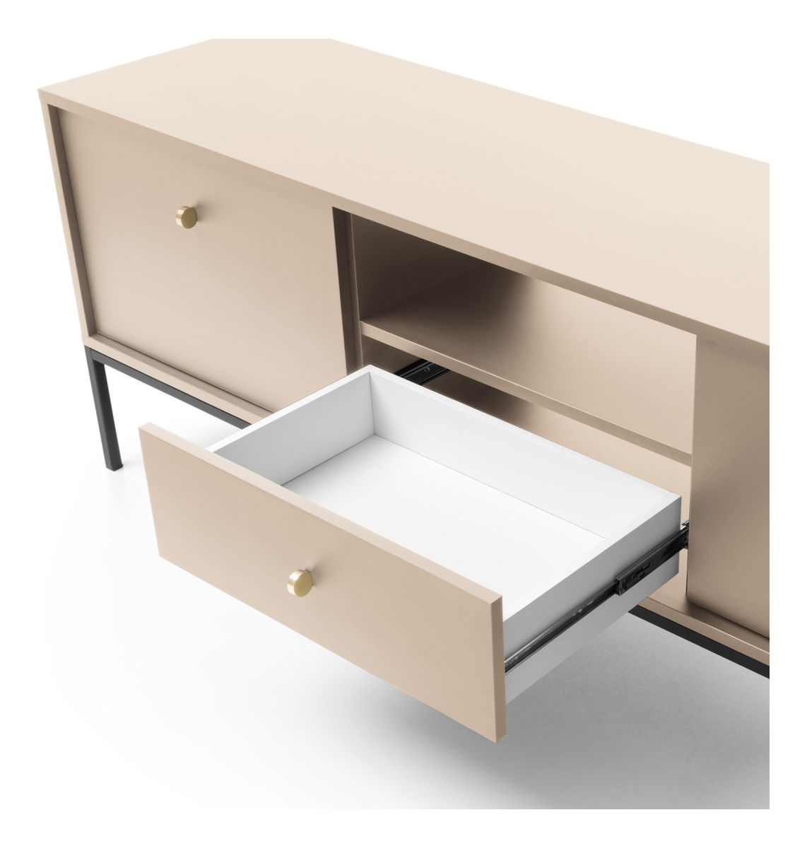 ZobrazitModerní TV skříňka v jednoduchých liniích, se dvěma dvířky a šuplíkem Montre si vás získá příjemnou pískovou béžovou barvou. Samozřejmostí je otvor pro vaše audio nebo video zařízení umístěné uprostřed stolku. Stolek má zlaté úchyty ve tvaru knoflíků a stojí na černých kovových nožičkách. Nábytek je vyroben z 16 mm silné laminované desky ošetřené ABS hranami.