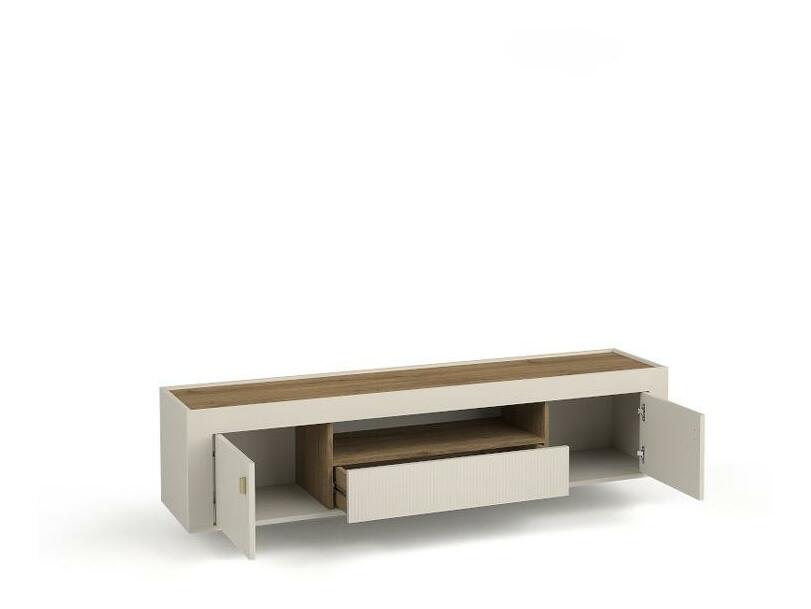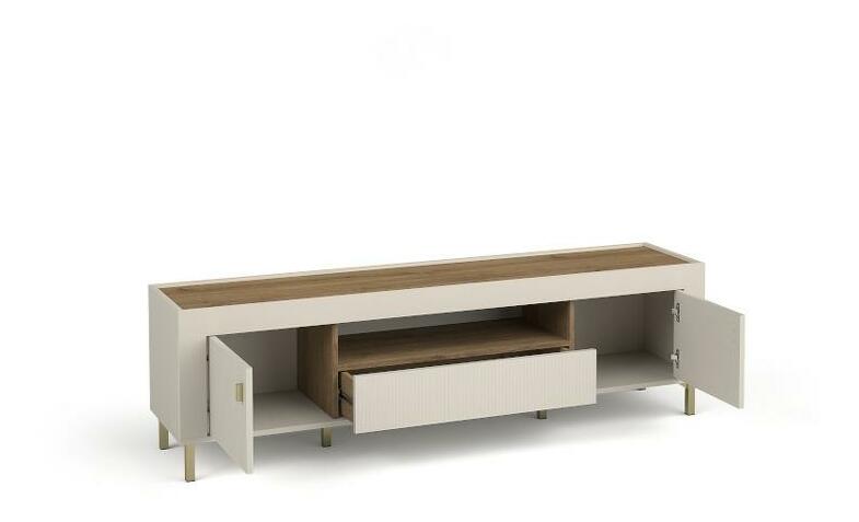 Chcete-li si zařídit funkční a moderní TV prostor, poohlédněte se po stolku RTV. Vybaven množstvím inovativních řešení poskytuje nejen estetický vzhled, ale také komfort používání. TV skříňka má vysoké nohy a minimalistický, avšak osobitý styl. Skříňka obsahuje dvojici dvířek a jednuzásuvku. Kromě toho poskytuje dvě odkryté poličky na audio systém/herní konzoli. Díky těmto prostorovým řešením se TV stolek stává nejen centrálním prvkem v TV prostoru, ale také praktickým místem pro odkládání elektronických zařízení, dálkových ovladačů, DVD nebo jiného drobného příslušenství.