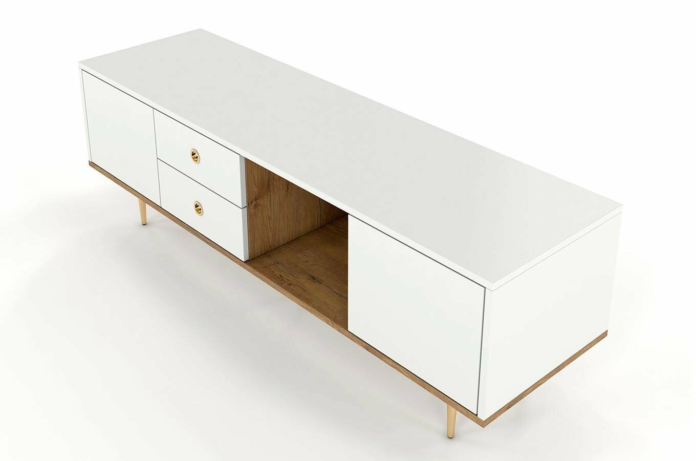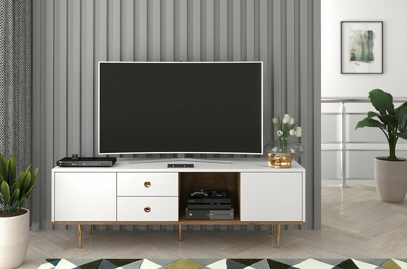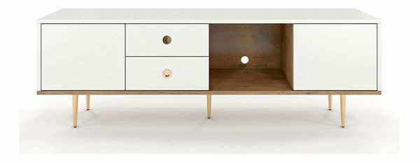 ZobrazitTV stolek/skříňka Naturlig Harmy o výšce 53,1 cm a hloubce 45 cm Bílá + Dub je praktický nábytek pro každou domácnost. Tento stolek nabízí dostatek úložného prostoru ve formě skříněk s push to open mechanismem. Korpus a přední desky jsou vyrobeny z kvalitní nábytkové desky o tloušťce 18 mm, která zaručuje pevnost a trvanlivost. Police a vnitřní stěny jsou z dubového dřeva, což dodává nábytku příjemný a přírodní vzhled. Nohy jsou vyrobeny z kovu se zlatou barvou, která krásně ladí s bílou a dřevem. Panty zaručují jemné zavírání, což je při používání velkou výhodou. TV stolek Harmy je skvělou volbou pro ty, kteří hledají funkční a moderní nábytek pro své obývací pokoje.