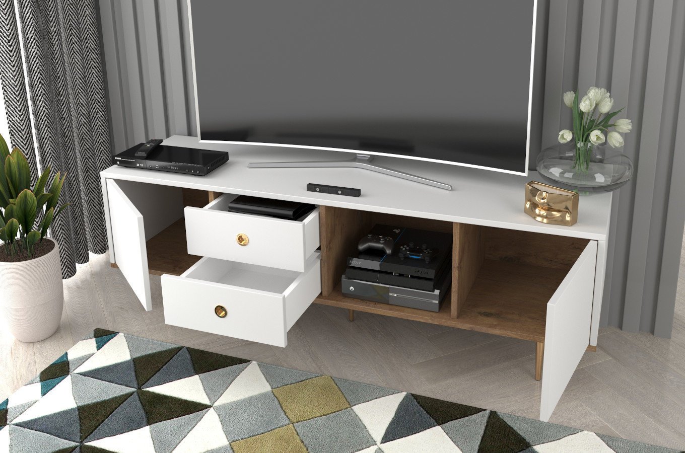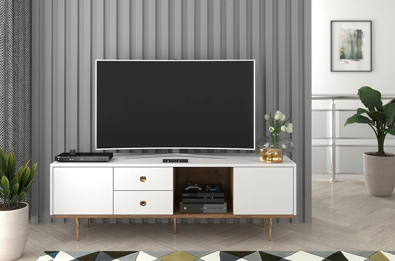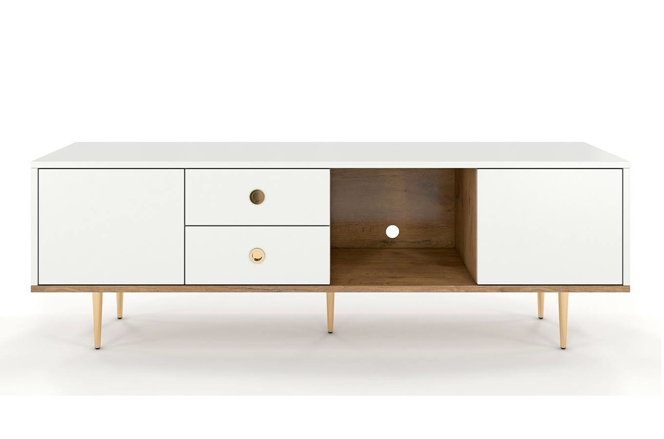 TV stolek/skříňka Naturlig Harmy o výšce 53,1 cm a hloubce 45 cm Bílá + Dub je praktický nábytek pro každou domácnost. Tento stolek nabízí dostatek úložného prostoru ve formě skříněk s push to open mechanismem. Korpus a přední desky jsou vyrobeny z kvalitní nábytkové desky o tloušťce 18 mm, která zaručuje pevnost a trvanlivost. Police a vnitřní stěny jsou z dubového dřeva, což dodává nábytku příjemný a přírodní vzhled. Nohy jsou vyrobeny z kovu se zlatou barvou, která krásně ladí s bílou a dřevem. Panty zaručují jemné zavírání, což je při používání velkou výhodou. TV stolek Harmy je skvělou volbou pro ty, kteří hledají funkční a moderní nábytek pro své obývací pokoje.