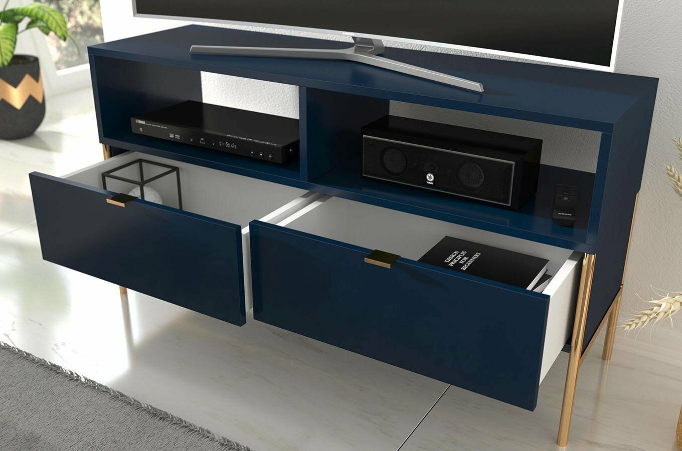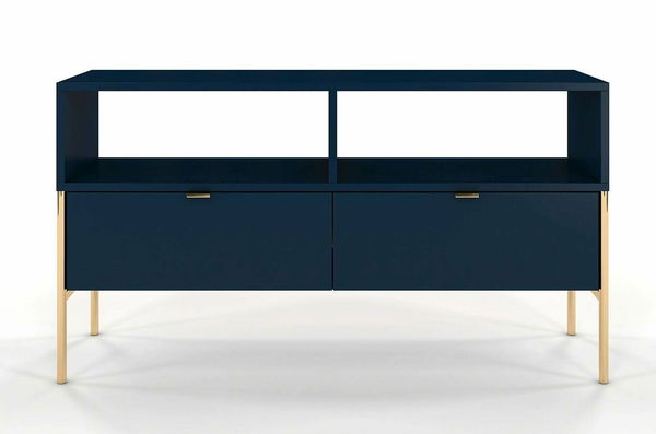 ZobrazitElegantní TV stolek/skříňka Naturlig Pollia v modré barvě o výšce 65 cm a hloubce 37 cm poskytuje dostatečný úložný prostor pro Vaše DVD/VIDEO zařízení. Otevřené police umožňují snadné uskladnění všech potřebných věcí. Zásuvky mají funkci tichého zavírání a otevírají se pomocí push to open. Korpus a přední části jsou vyrobeny z kvalitní nábytkové desky o tloušťce 18 mm. Nohy jsou kovové a mají zlatou barvu. Panty zajišťují jemné zavírání. Tento stolek/skříňka v modré barvě bude skvělým doplňkem pro Váš obývací prostor.