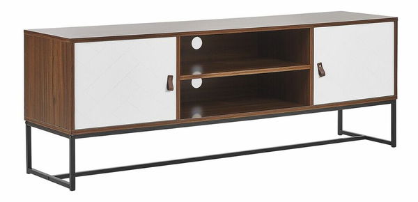 Pokud hledáte tradiční nábytek s moderním nádeších, tato TV skříňka je pro vás dokonalou volbou. Je vyrobena z odolného MDF materiálu v kombinaci bílé barvy a tmavého dřeva. Skříňka stojí na černém kovovém podstavci, který jí dodává stabilitu. Tento kousek nabízí dostatek úložného prostoru v podobě dvou skříněk a dvou polic, na něž můžete uložit všechny oblíbené předměty či dekorace. Dokonale zpracované detaily, jako jsou úchyty z umělé kůže či matná přední dvířka s jemným vzorem rybí kosti, umocňují její sofistikovaný vzhled a poutají pozornost.
