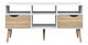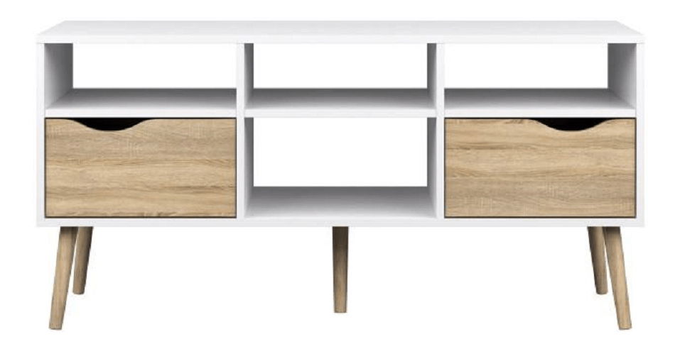 Tento retro TV stolek ocení milovníci staršího designu nábytku. Stolek je však i velmi praktický. Na levé a pravé straně se nacházejí odkládací zásuvky a stolek mě čtyři poličky, které můžete využít i pro vaše AV zařízení. Úchyty na zásuvkách stolku jsou stylově vykrojené. Barevné provedení stolku je bílá v kombinaci s dubem sonoma.