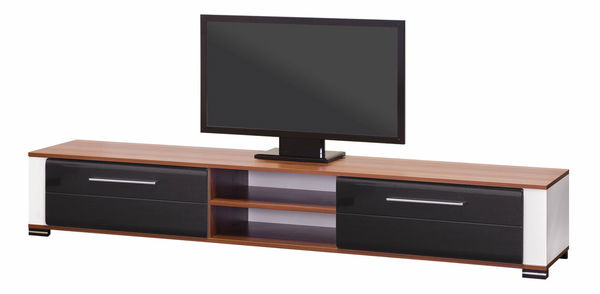 Větší TV stolek/skříňka s dvěma dvířky a otevřeným úložným prostorem pro uložení audio/video příslušenství.