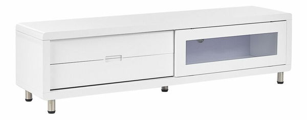 Vneste do svého obývacího pokoje moderní design s touto nízkou TV skříňkou. Díky vysoce lesklému bílému povrchu nabízí stylový vzhled a vysokou funkčnost. Součástí jsou dvě zásuvky a skříňka s posuvnými dveřmi. Na zadní straně je otvor pro kabely, abyste mohli snadno připojit elektronická zařízení k televizoru.