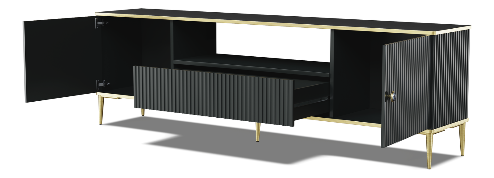 ZobrazitTV stolek Pietro je jedinečný kousek, který dodá luxusní nádech každému okouzlujícímu nebo modernímu obývacímu pokoji. Jeho dekorativní vzhled je výsledkem precizního frézování na předních a bočních stranách, které mu dodává eleganci a sofistikovanost. Zlaté akcenty, jako jsou kovové nohy, úchyty a hrany, nejenže dodávají sérii Pietro lesk, ale umožňují vám také vytvořit jedinečné aranžmá založené na klasických barvách. Otevřená police poskytuje ideální prostor pro dekodér, konzoli nebo předměty, které chcete vystavit, čímž dodává interiéru extra nádech elegance. Prostorná zásuvka a boční skříňky vám navíc umožňují uložit příslušenství a udržovat váš obývací pokoj uklizený. Tento dvoudveřový TV stolek z kolekce PETRA kombinuje dekorativní design se snadným používáním a funkčností, díky čemuž je nejen elegantním dekorativním prvkem, ale také praktickým řešením pro uložení elektroniky v obývacím pokoji.