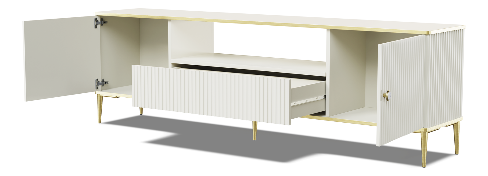 ZobrazitTV stolek Pietro je jedinečný kousek, který dodá luxusní nádech každému okouzlujícímu nebo modernímu obývacímu pokoji. Jeho dekorativní vzhled je výsledkem precizního frézování na předních a bočních stranách, které mu dodává eleganci a sofistikovanost. Zlaté akcenty, jako jsou kovové nohy, úchyty a hrany, nejenže dodávají sérii Pietro lesk, ale umožňují vám také vytvořit jedinečné aranžmá založené na klasických barvách. Otevřená police poskytuje ideální prostor pro dekodér, konzoli nebo předměty, které chcete vystavit, čímž dodává interiéru extra nádech elegance. Prostorná zásuvka a boční skříňky vám navíc umožňují uložit příslušenství a udržovat váš obývací pokoj uklizený. Tento dvoudveřový TV stolek z kolekce PETRA kombinuje dekorativní design se snadným používáním a funkčností, díky čemuž je nejen elegantním dekorativním prvkem, ale také praktickým řešením pro uložení elektroniky v obývacím pokoji.