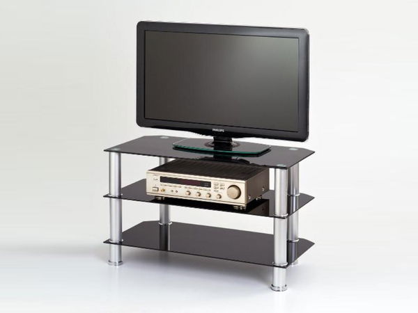 Moderní TV stolek Vás zaujme svou funkčností a designem. Tři úrovně z tmavého skla jsou spojeny kovovými díly pro doplnění vizuálního požitku z nábytku. Je vhodný jako doplněk do obývacího pokoje.