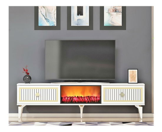 TV stolek/skříňka s krbem Kebive (bílá + zlatá)