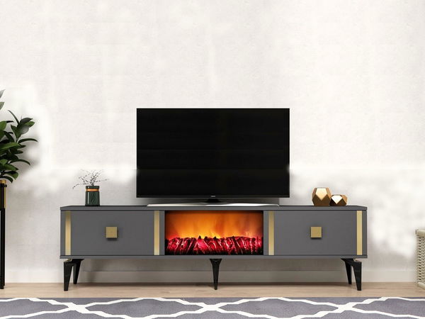 TV stolek/skříňka s krbem Tobuvu 2 (antracit + zlatá)