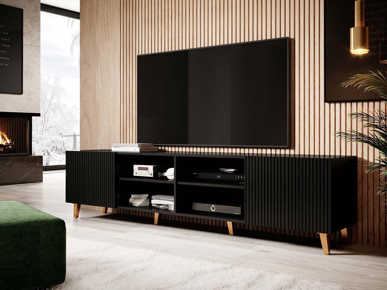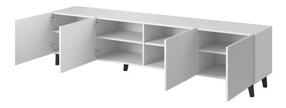 ZobrazitTV skříňka Saphina 200 je moderní a bude vypadat skvěle v inovativní domácnosti. Nábytek je natolik jedinečný, že se bude hodit k jinému nábytku, který nemusí mít nutně podobný styl. Jeho sladění se zbytkem interiéru závisí na vašem individuálním stylu. Přední části vděčí za svůj jedinečný vzhled podélným frézám, které vytvářejí nezapomenutelný inovativní design. Televizní stolek má interiér velmi prostorný, rozdělený do mnoha polic, abyste si mohli vybrané věci jednoduše roztřídit.