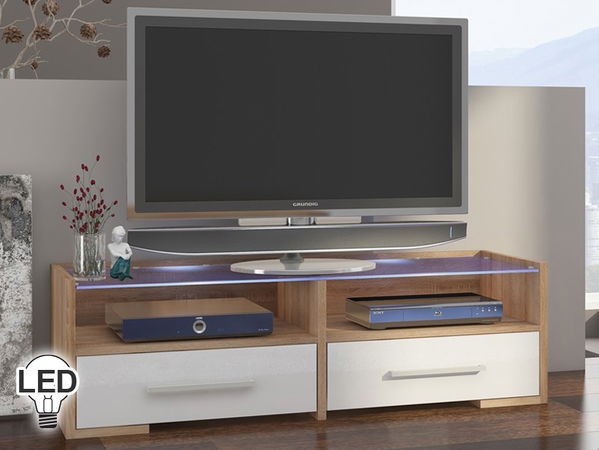 Nádhernou atmosféru po setmění umí navodit právě tento TV stolek. Volitelné LED osvětlení horní prosklené poličky vypadá super a dodá nábytku a místnosti úžasný efekt. Navíc je velmi praktický s dvěma otevřenými odkládacími prostory a dvěma zásuvkami. Barevné provedení je sonoma světlá v kombinaci s bílou ve vysokém lesku.