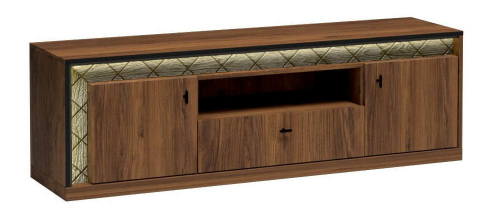 ZobrazitTV skříňka do obývacího pokoje. Nábytek z kolekce Sensei v barvě ořech kombinovaný s černou dekorační deskou. Střední část je funkční police pro set-top box nebo hudební aparaturu, pod prostornou zásuvkou. Po stranách dvě skříňky na další věci. Skříňka v kombinaci s vitrínou nebo komodou do obývacího pokoje vytvoří krásný interiér v každé domácnosti. Nasvícením části dřevěnou, černou deskou se z ní stane interiér v italském stylu hvězd. Dekorace vypadá jako zlatá vložka.