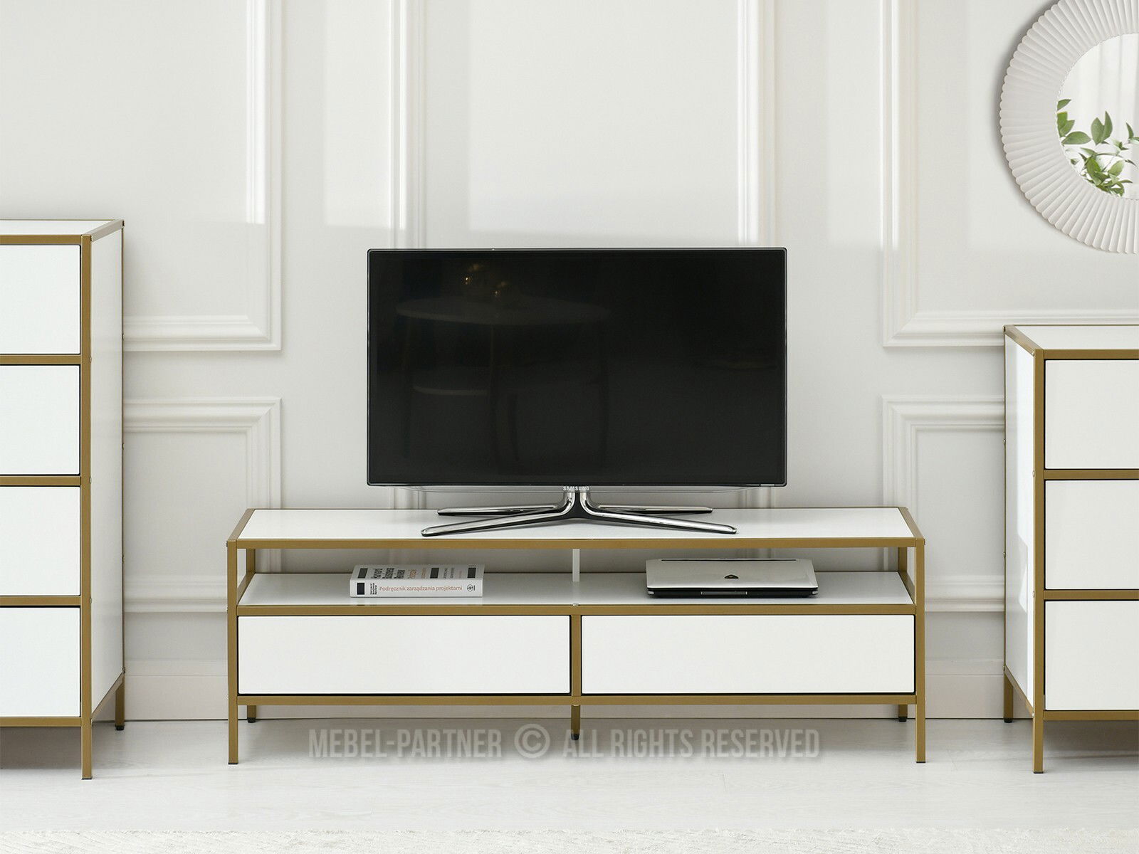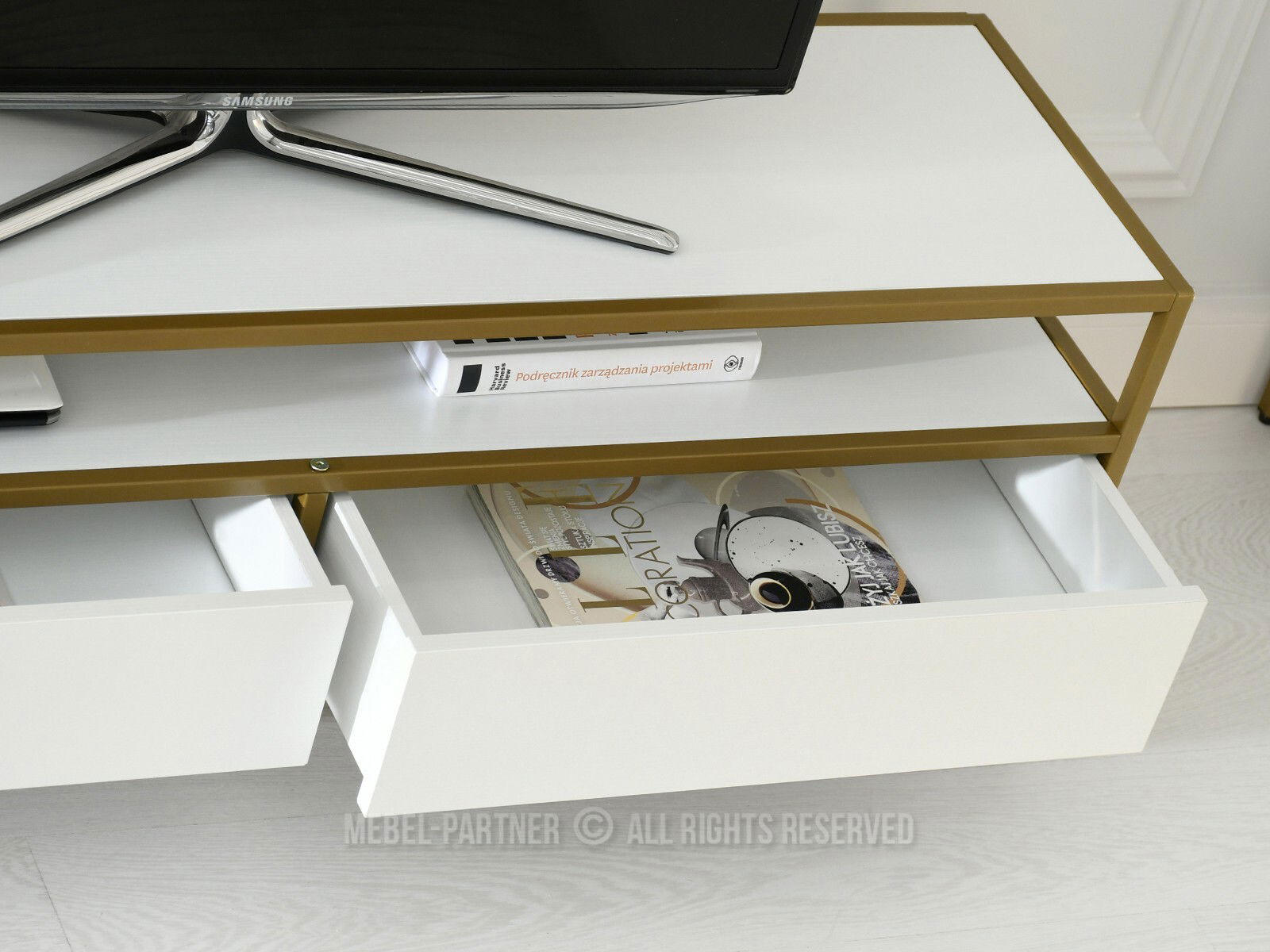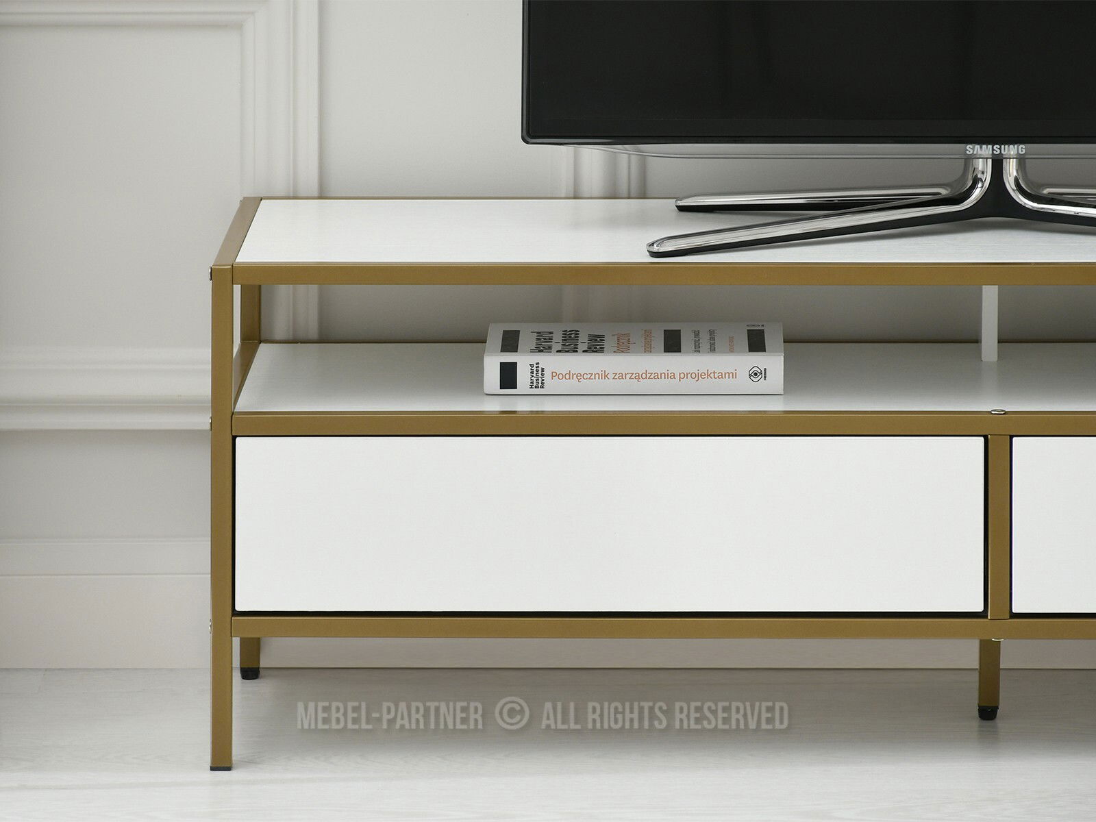 TV stolek/skříňka Soren Rtv (bílé dřevo + zlatá)